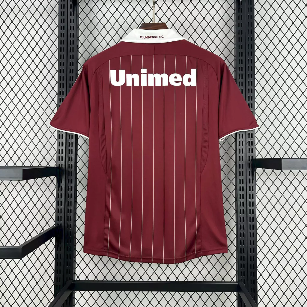 A Camisa Fluminense - 2007 Third apresenta um design alternativo em tons escuros, destacando o escudo do clube bordado no peito. Ideal para os torcedores que gostam de peças diferenciadas, essa camisa celebra a tradição tricolor com um toque moderno.