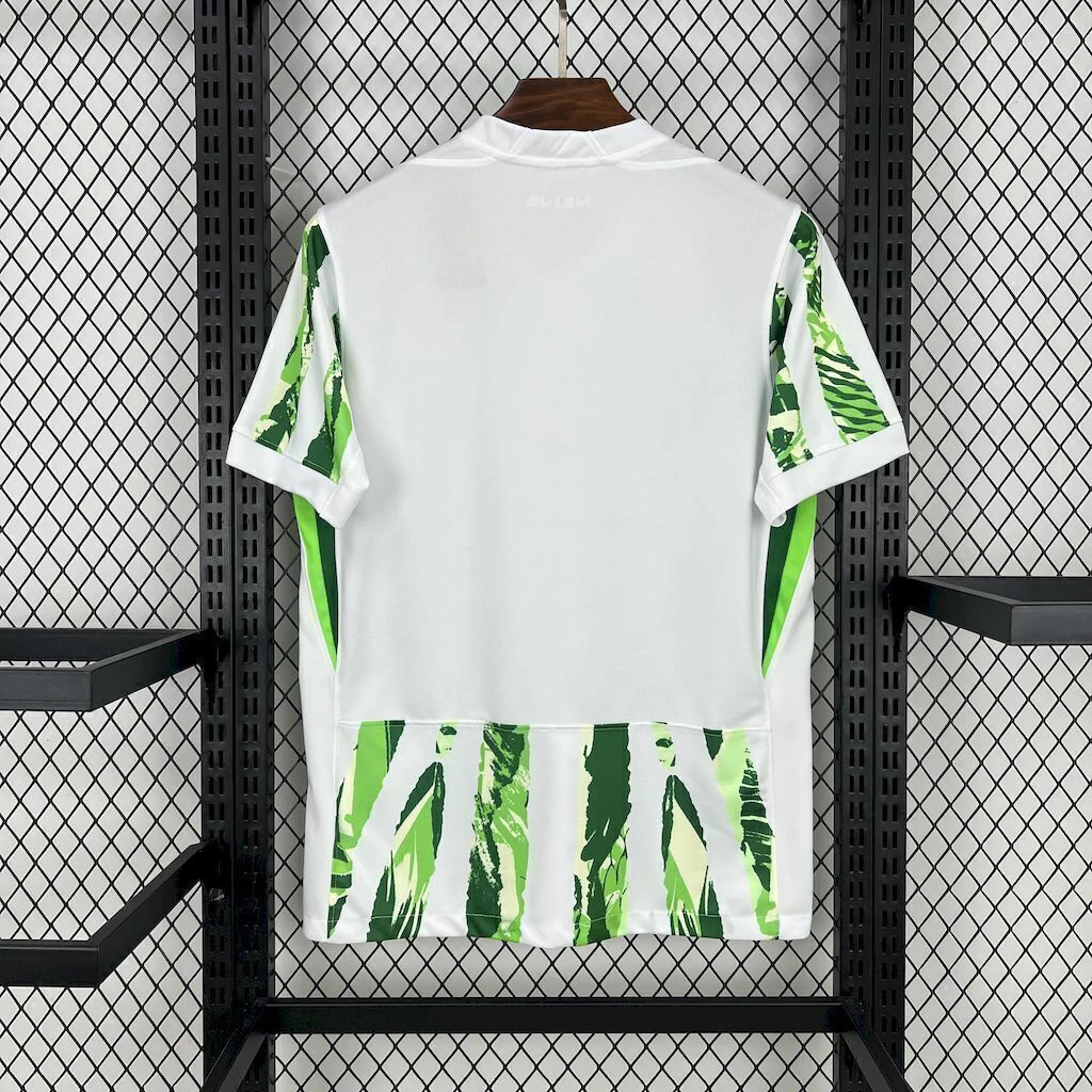 Inspirada nas cores vibrantes da seleção nigeriana, esta Home traz base predominantemente verde com grafismos em branco que remetem à tradição tribal do país. Confeccionada em tecido leve de alta performance com tecnologia de controle de umidade e secagem rápida, oferece excelente ventilação e conforto tanto em partidas no Estádio Nacional de Abuja quanto no uso cotidiano. O corte anatômico proporciona ajuste preciso e liberdade de movimento, ideal para torcedores que desejam exibir seu apoio aos “Super Eagles” com muito estilo.
